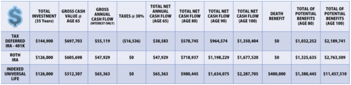 And assuming a combined tax rate of 30% the net after tax values in the fifth column show $38,585 for the pre-tax plans, $47,929 for the Roth and $55,363 for the IUL. Tax planning is critical and deferring the tax break until retirement looks to be the new default “best” way to structure a retirement plan.
